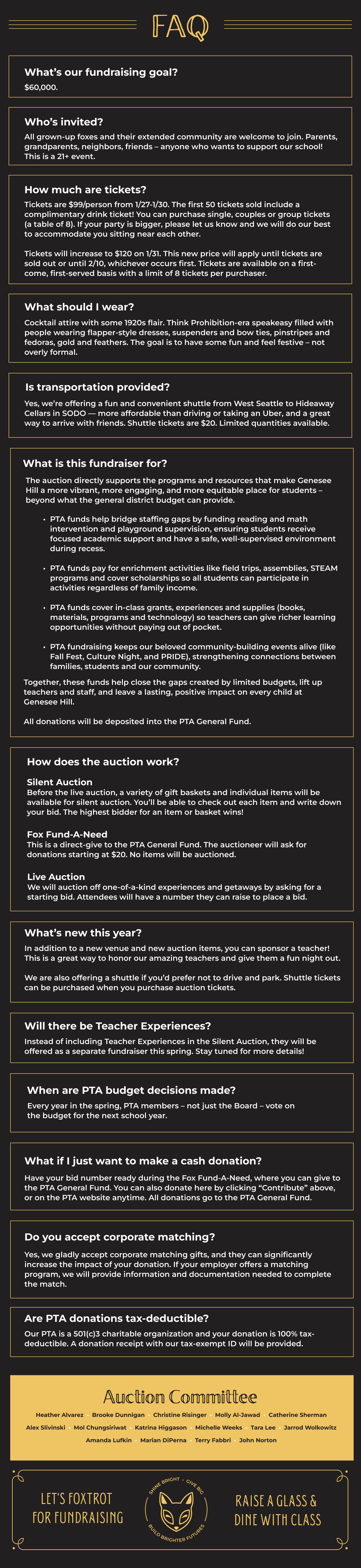 Are you ready to step back into the Roaring '20s? Our speakeasy-style auction will sparkle with gold-and-glam décor and feature silent and live auctions, stunning student art, and one-of-a-kind experiences you won't find anywhere else. This adults-only evening is a can't-miss chance to raise a glass, mingle with friends, and foxtrot your way to fundraising — all in support of Genesee Hill and our Fox community.